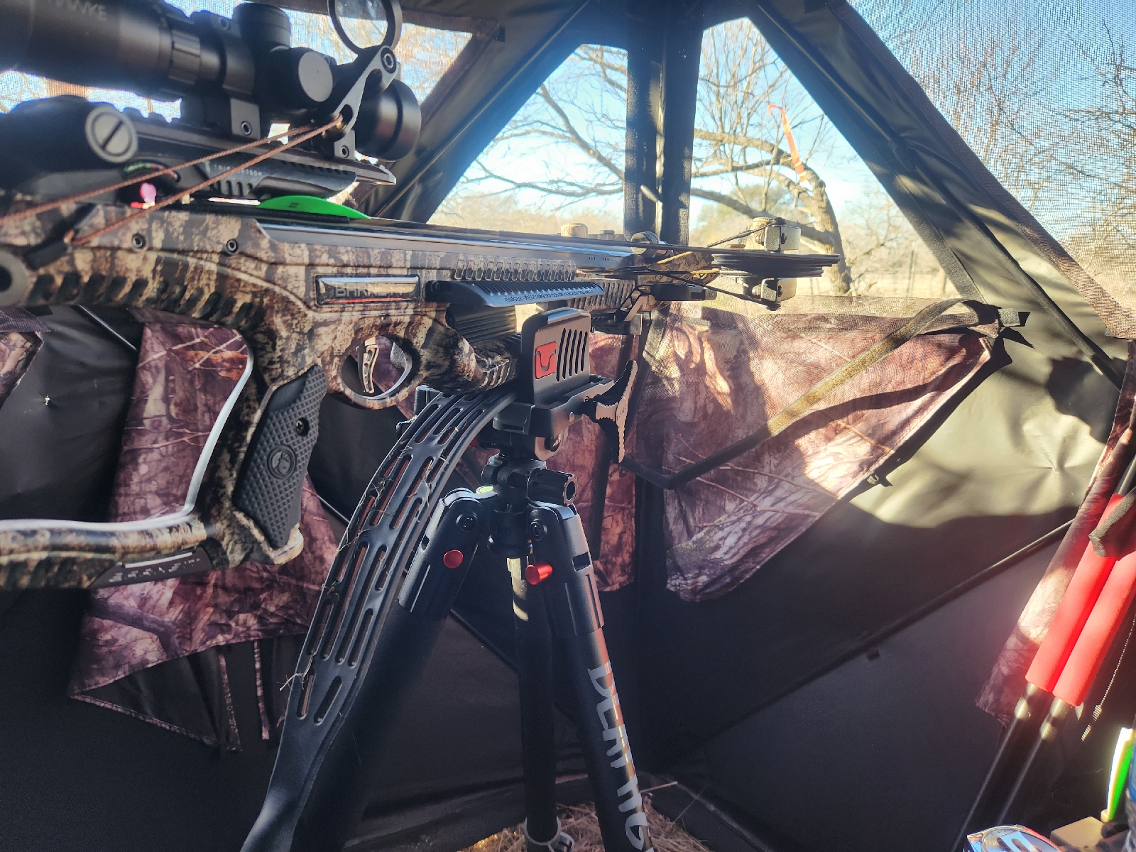 What a beautiful morning 3 mph west wind, clear skies and 31 degrees. Here I am sitting in the pop up at camp stand. I have a bog pod death grip that my crossbow is sitting in, I practiced with it at the house and it really is a game changer for me. Nothing seen in morning. Got to pop up around 330. Wind is non existence coming from west maybe 3 mph. Feeder goes off at 430 which attracts the doves, cardinals and red shouldered blackbirds.